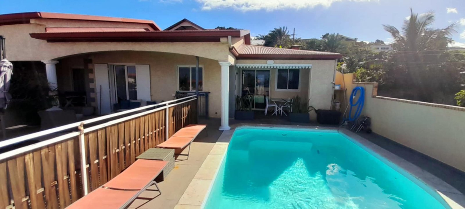 - Varangue : Table, 4 chaises, étendoir, douche pour l’accès à la piscine.